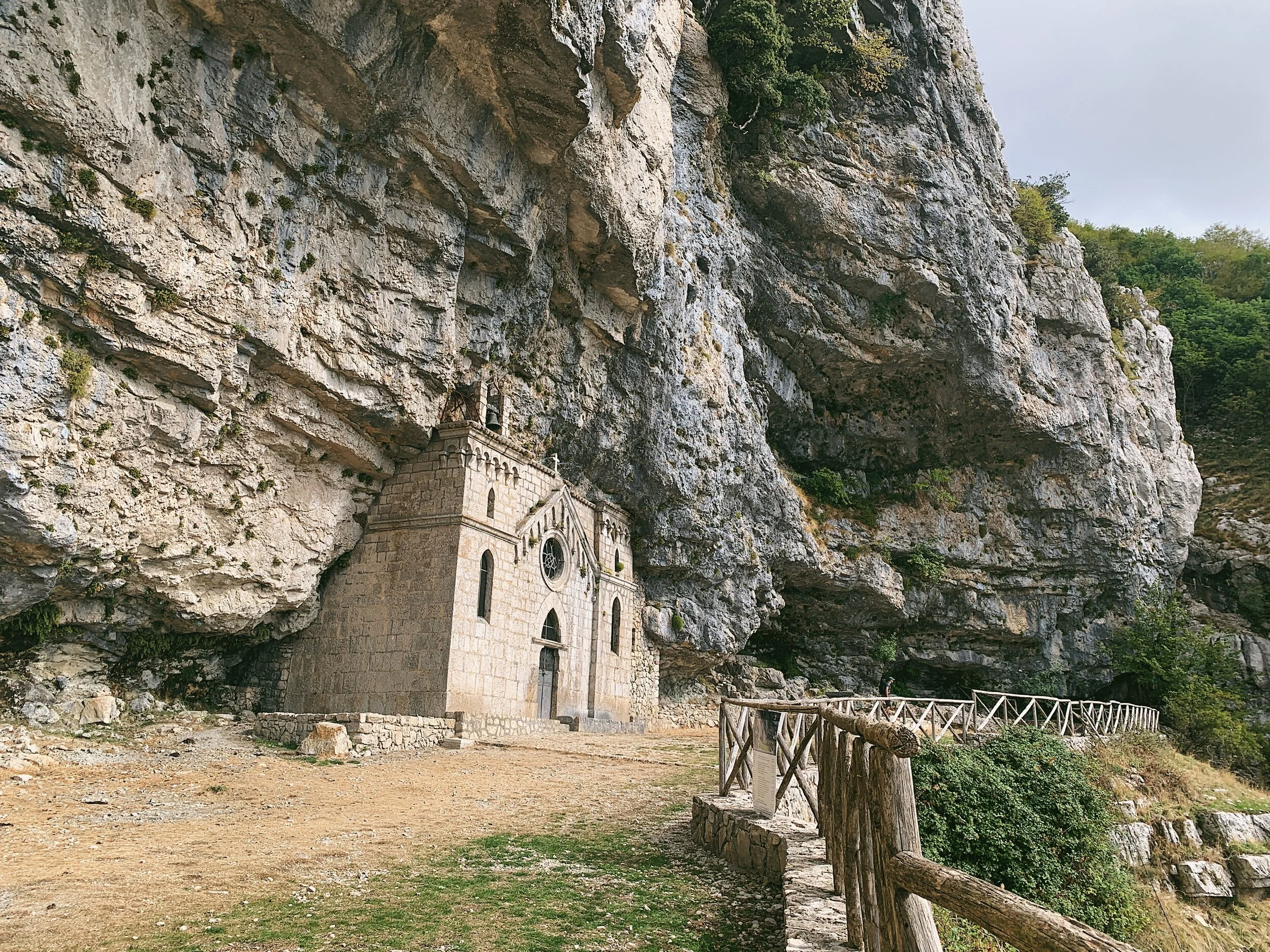 The path then continues further uphill to the third point, the Hermitage of San Michele Archangelo. The sanctuary is squished under the rocks and is barely visible until you are virtually in front of it. Dating back to 830 AD, the hermitage was rebuilt in 1893 in the Gothic style. It’s situated at 1158 metres and the views from here are spectacular. From the internal walls and the vault you can often hear the dripping of water, which is the sound of the spring dripping into a pool. Inside the hermitage (which is usually locked) there is a statue of San Michele - you can peer through the gap in the doors. It looks very spartan inside. Continue to the back of the ‘balcony’ and there is a stone pool which the cattle use as a trough. This is the third chance to turn around and return to the car park or rifugio.