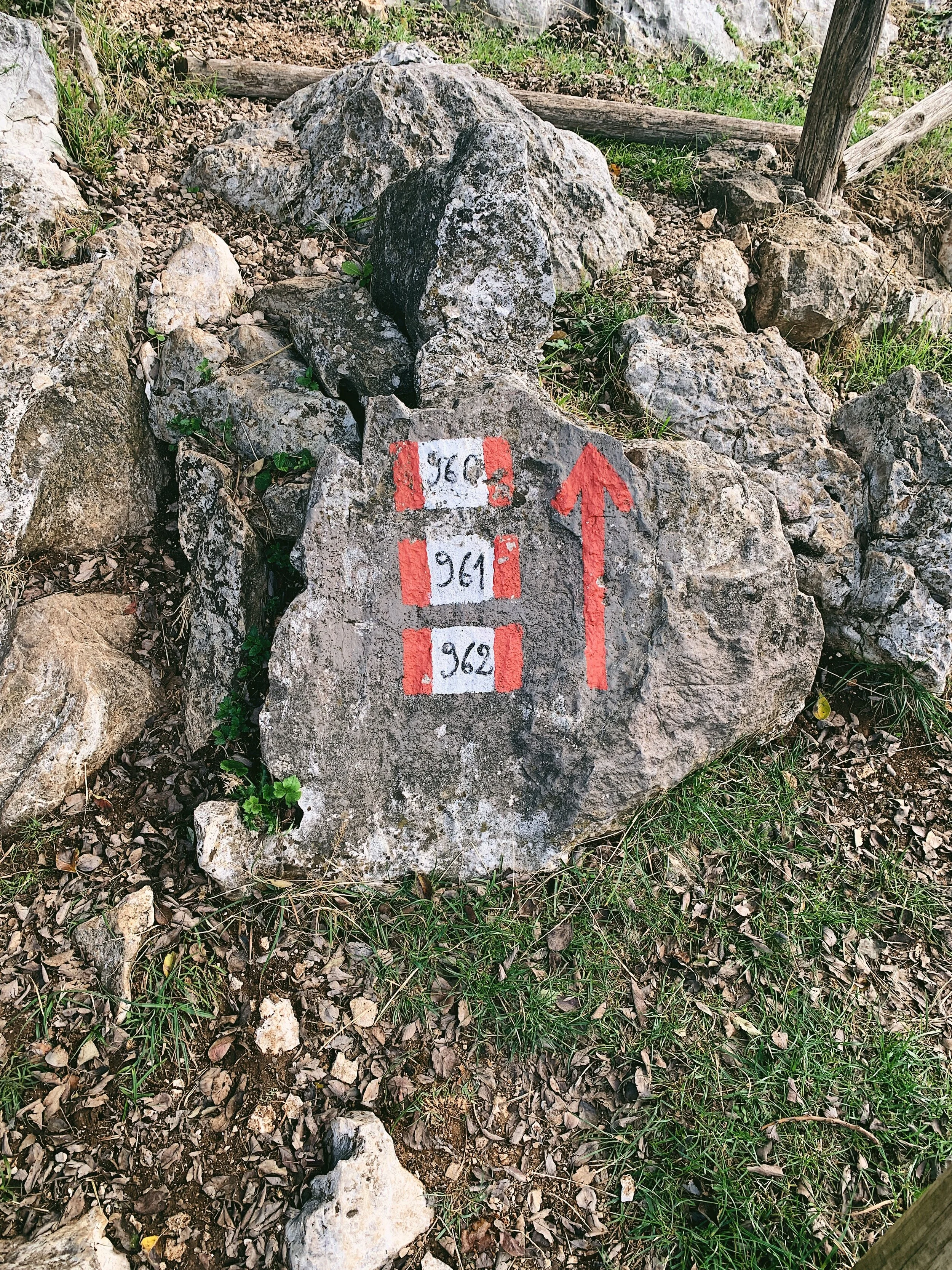The trail is well signposted. There is a map board at the back of the car park which shows the routes nearby. The route you are following is 960; follow the red and white CAI markings which are painted along the rocks and fenceposts along the way. The route is well formed and very straightforward: straight up and down the same way. It’s very hard to get lost.