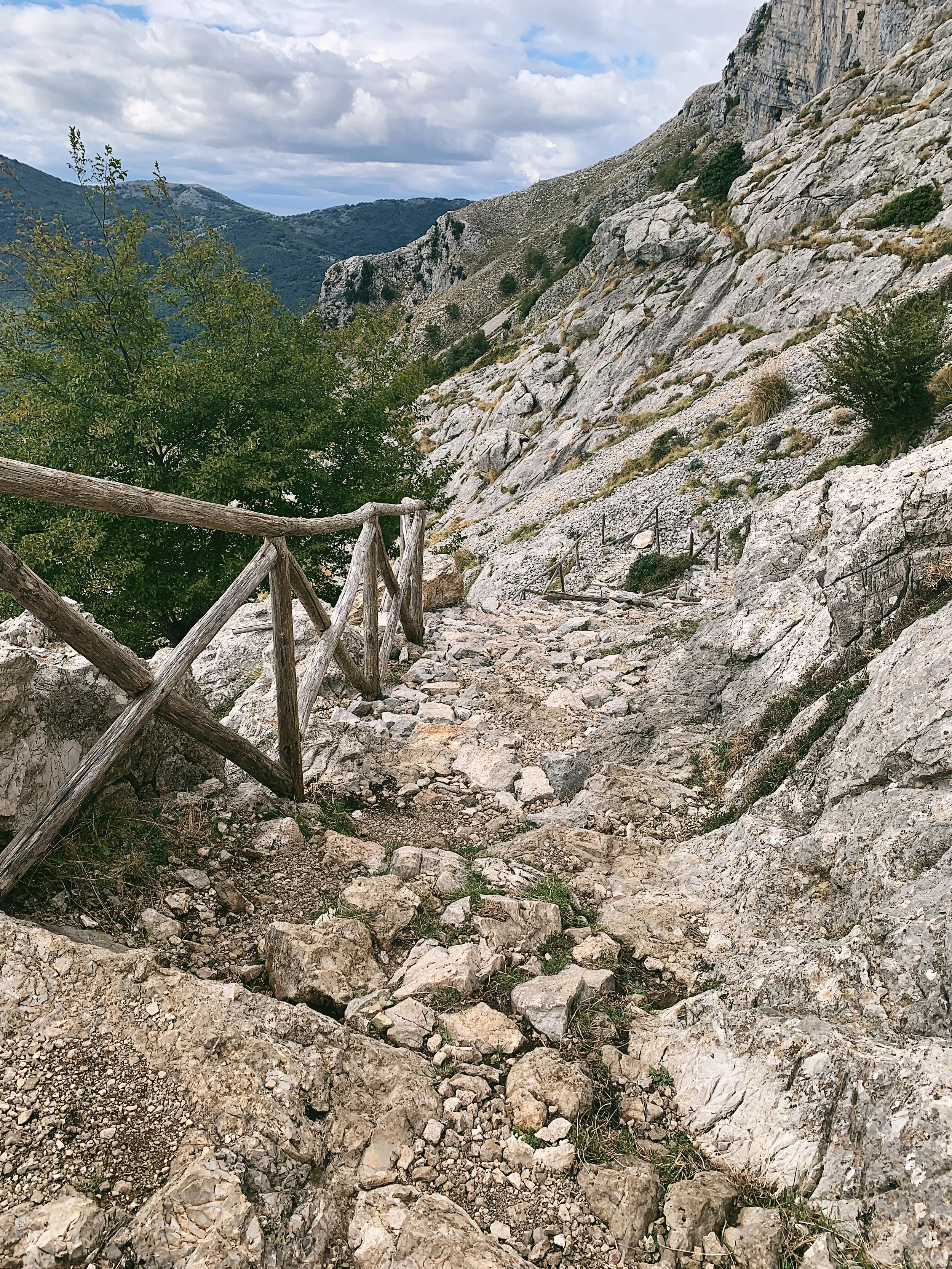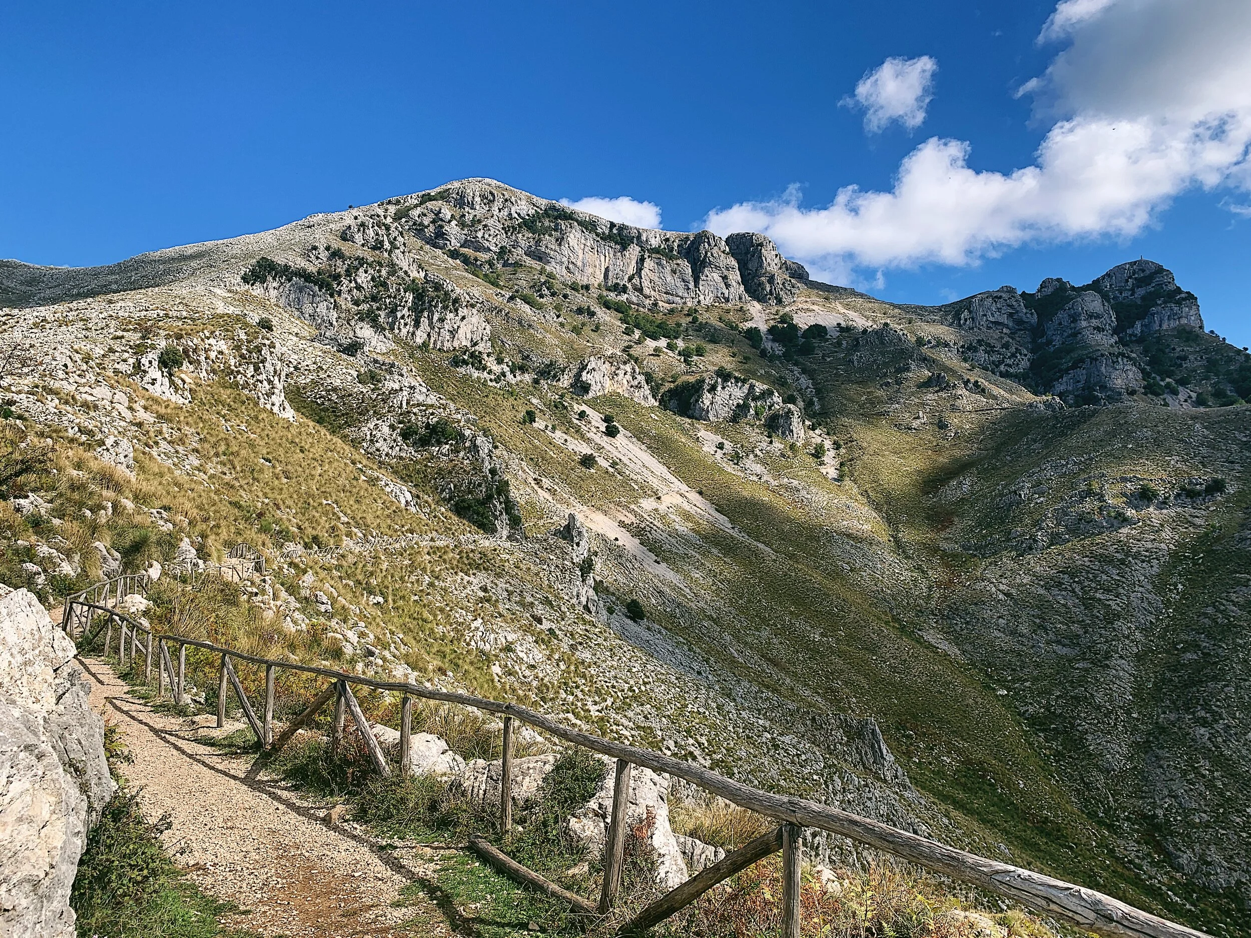 The mountains themselves are so faulted and cracked that they retain almost no rainfall: any flowing water sinks to springs in the lower flanks while the stream beds are drier than dust. There are many forest fires here and, as of October 2021, there is a vast area of scorched earth on the hill facing the rifugio, while several sections of the handrail have been damaged by fires.