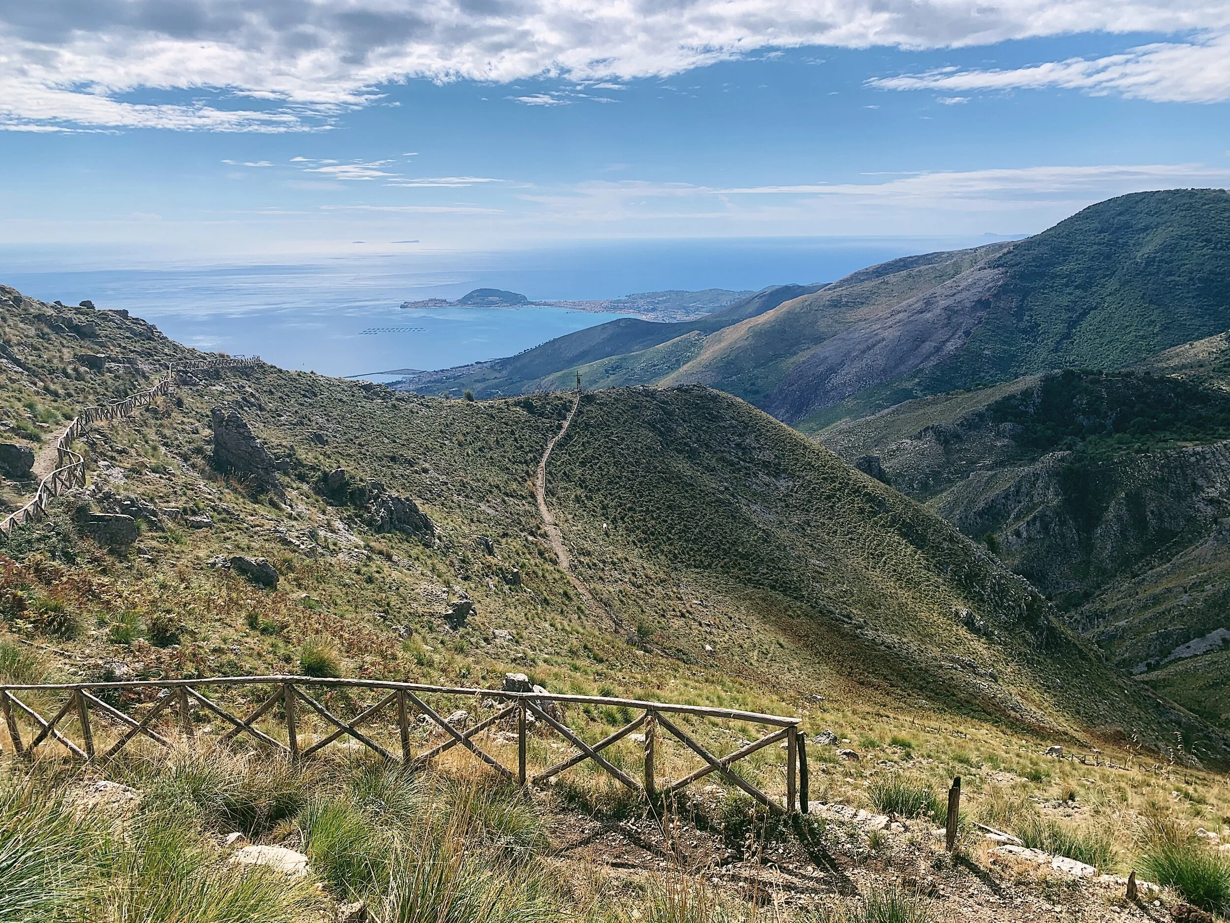The trail begins below Rifugio Pornito; you can see the sea even from the car park. Follow the trail along the contour of the hill with the sea to your right. The path climbs steadily uphill, with several benches on the left with places to stop and rest if needed. After a kilometre or so the path gets steeper and rises to a cross which looks out over Gaeta and Formia below. Younger children will probably be able to make it this far.
