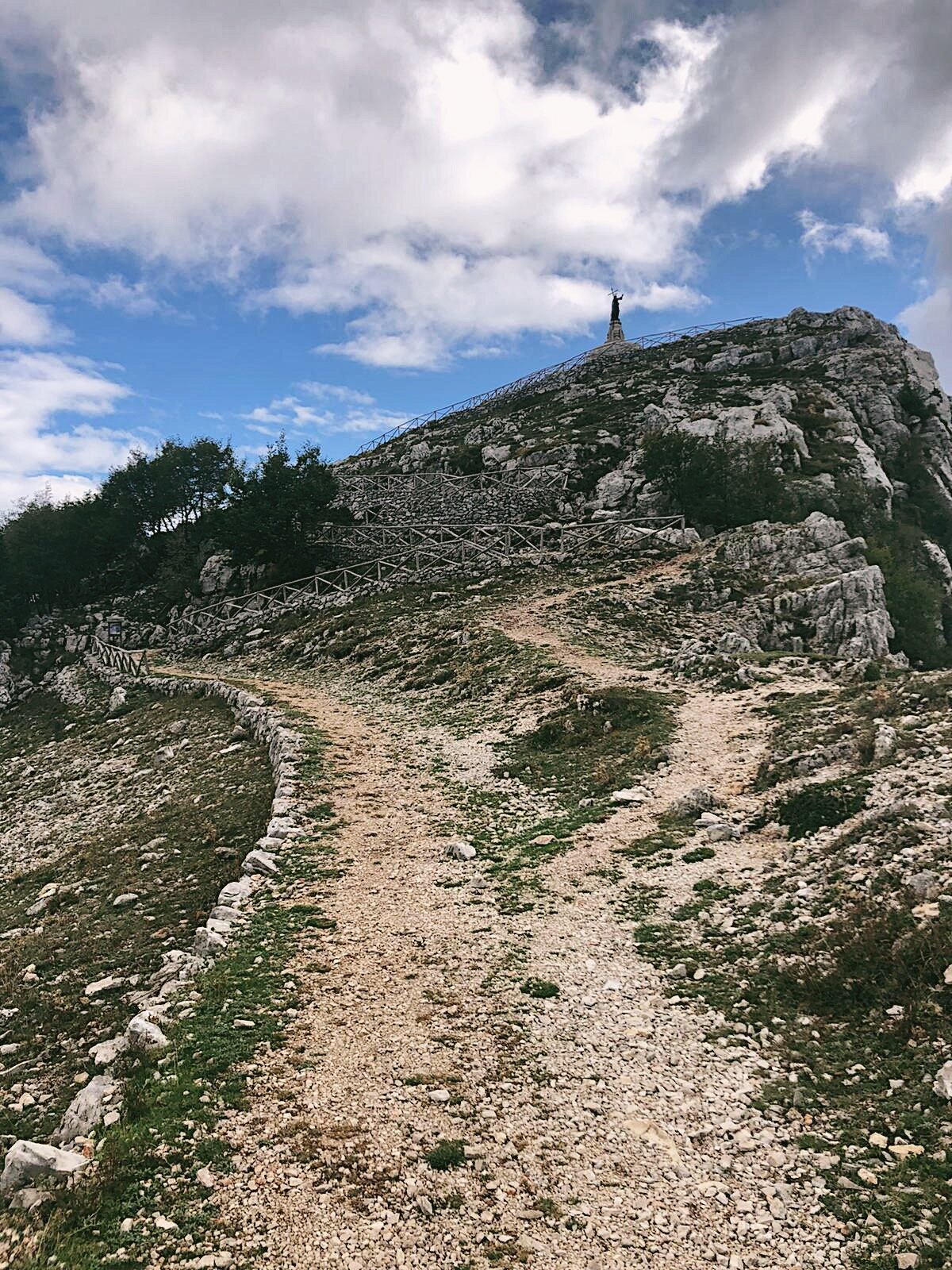 After a pause to view the hermitage, return to the path and continue uphill for the last section of the walk. This section is has, predictably, the best views, given its ascent to 1252 metres above sea level. The path continues steadily upwards until you reach a barren, karst plateau littered with pale rocks. Here there are a number of map boards and direction markings to other routes in the mountains. Ignore the path continuing through the plateau and instead head up to the right, towards the unmistakable statue atop the nearest peak. This is Cima del Redentore, often remarked as one of the most beautiful views in the Apennines.