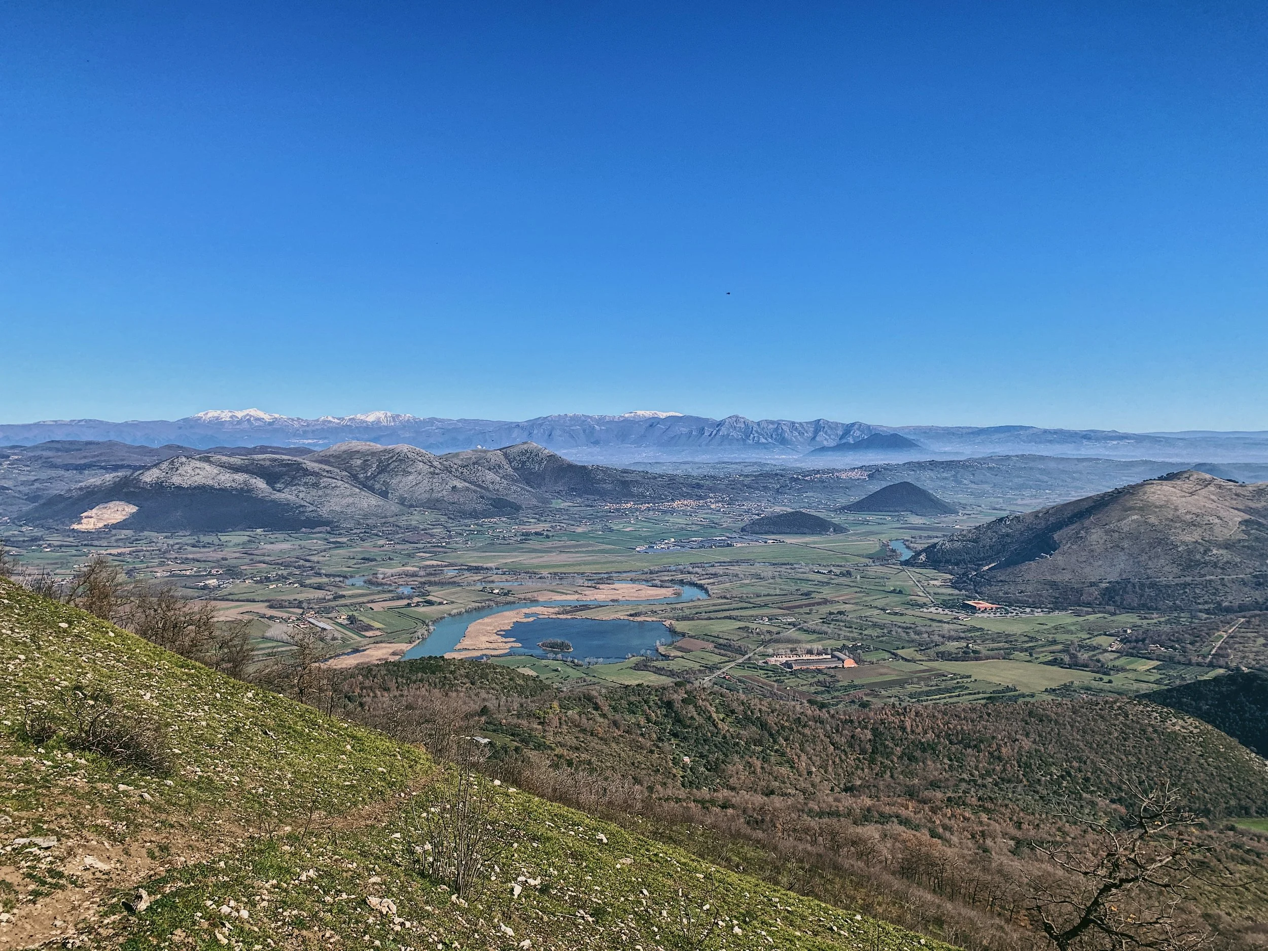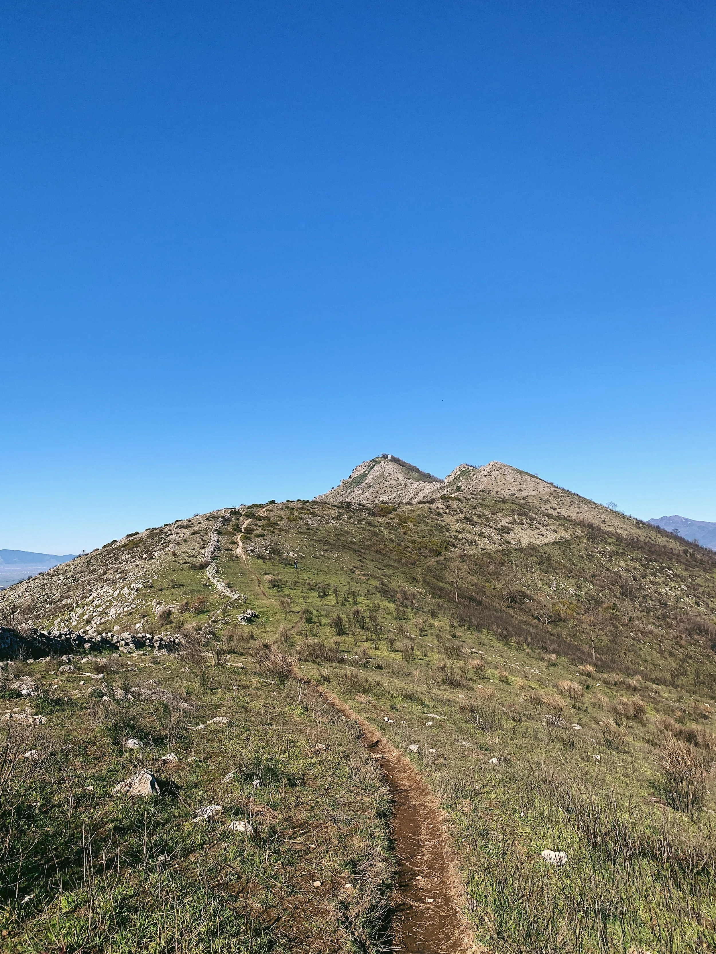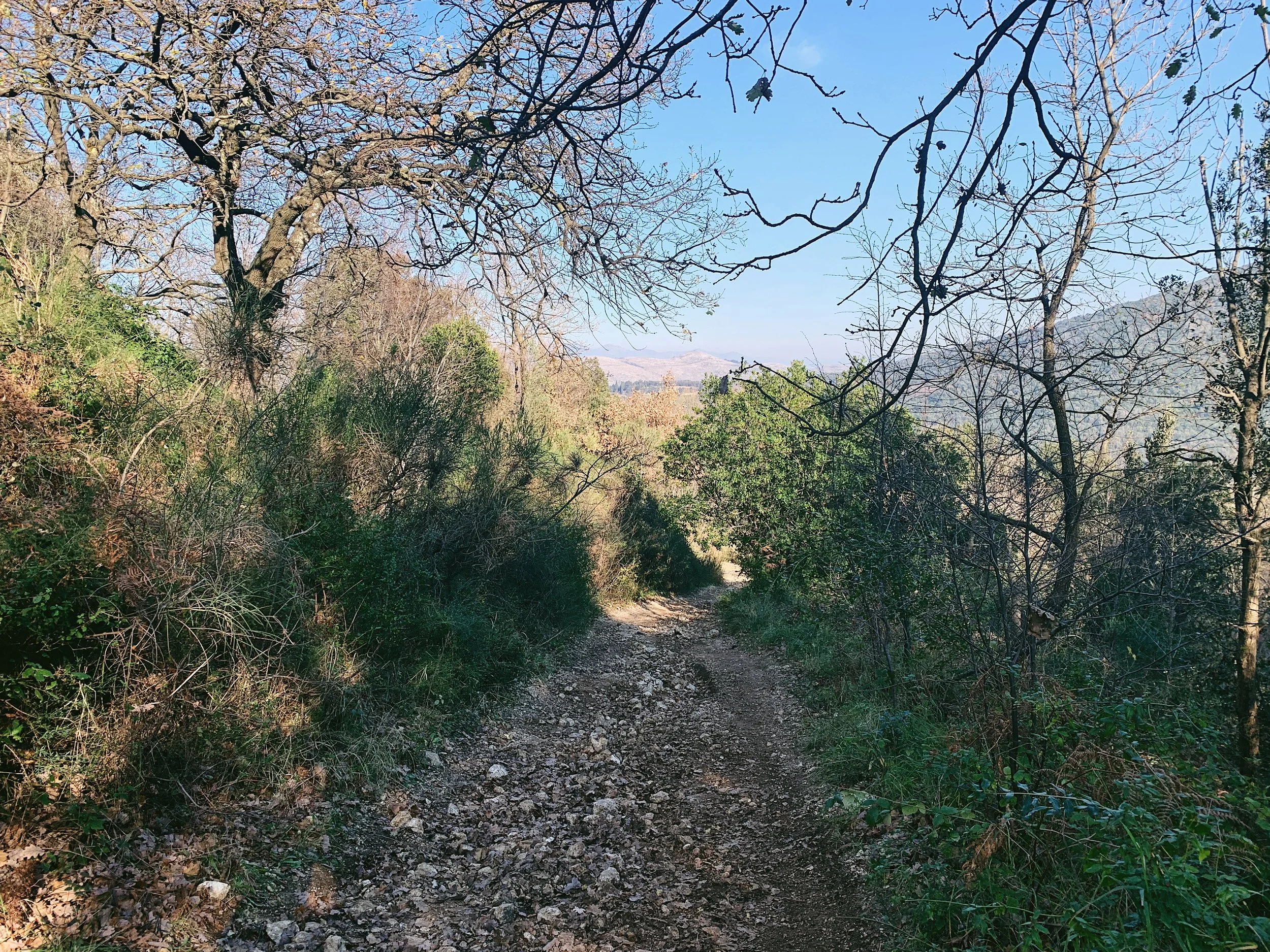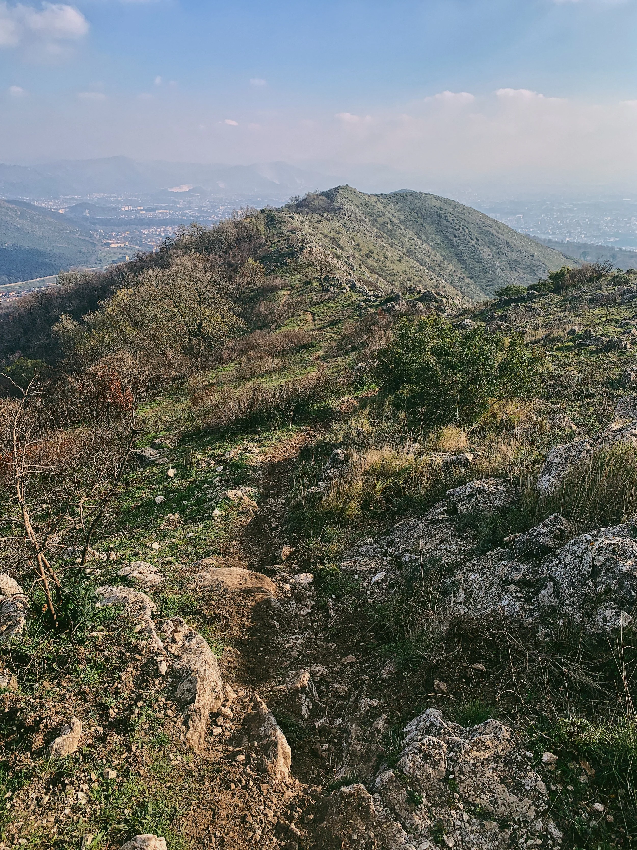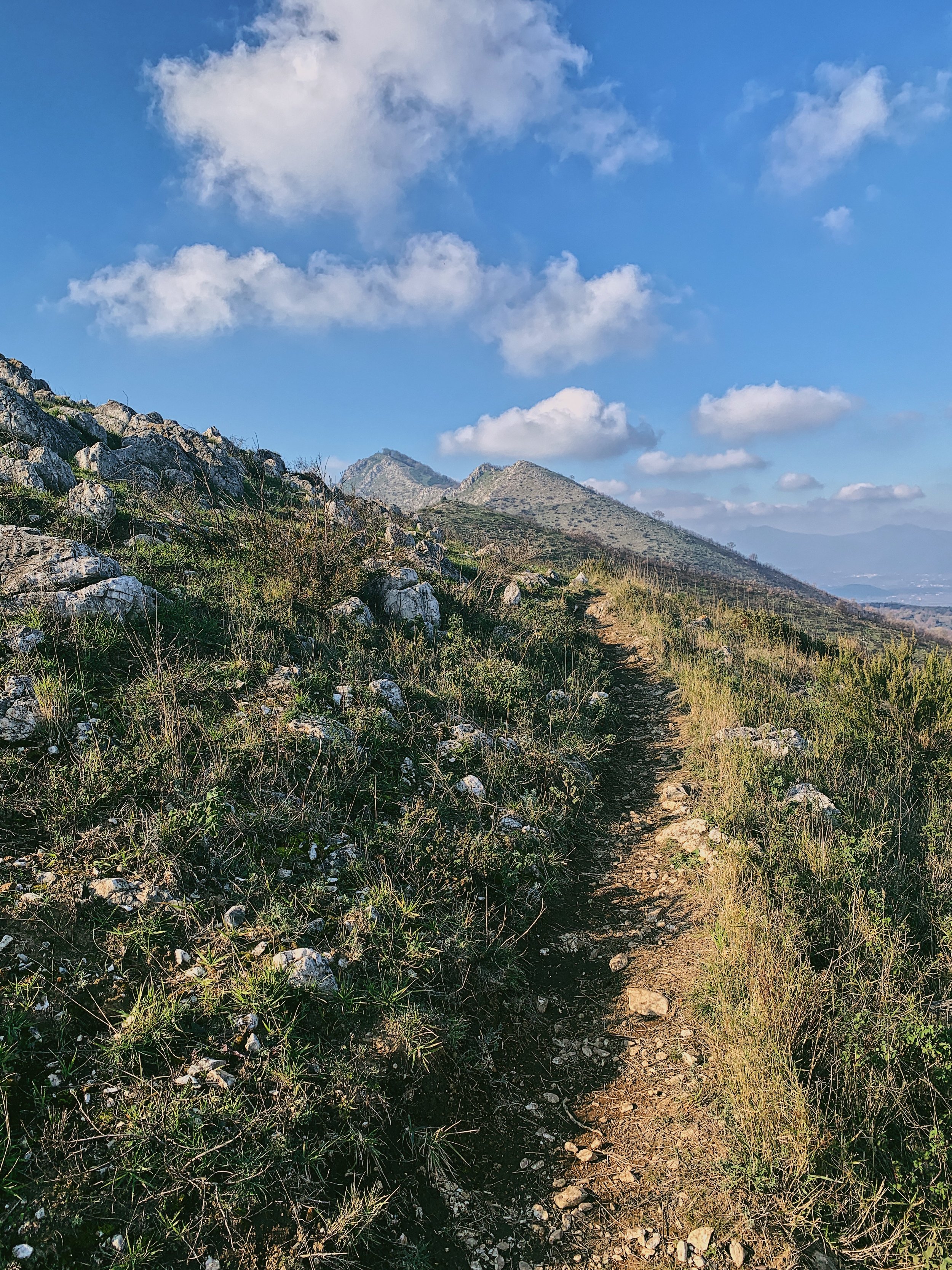 After almost a kilometre you’ll reach the saddle in the hills with the CAI rifugio up to your right. Continue past the rifugio and then follow the defined single track up to the right - you’ll see it ahead of you disappearing up and over the hills. Several of the larger stones have CAI markers on them so you know you’re on the right track. To your right you can see the hill which towers above the Diana and Actaeon Fountain at the end of the Grand Cascade: one of Caserta Palace’s most iconic monuments.