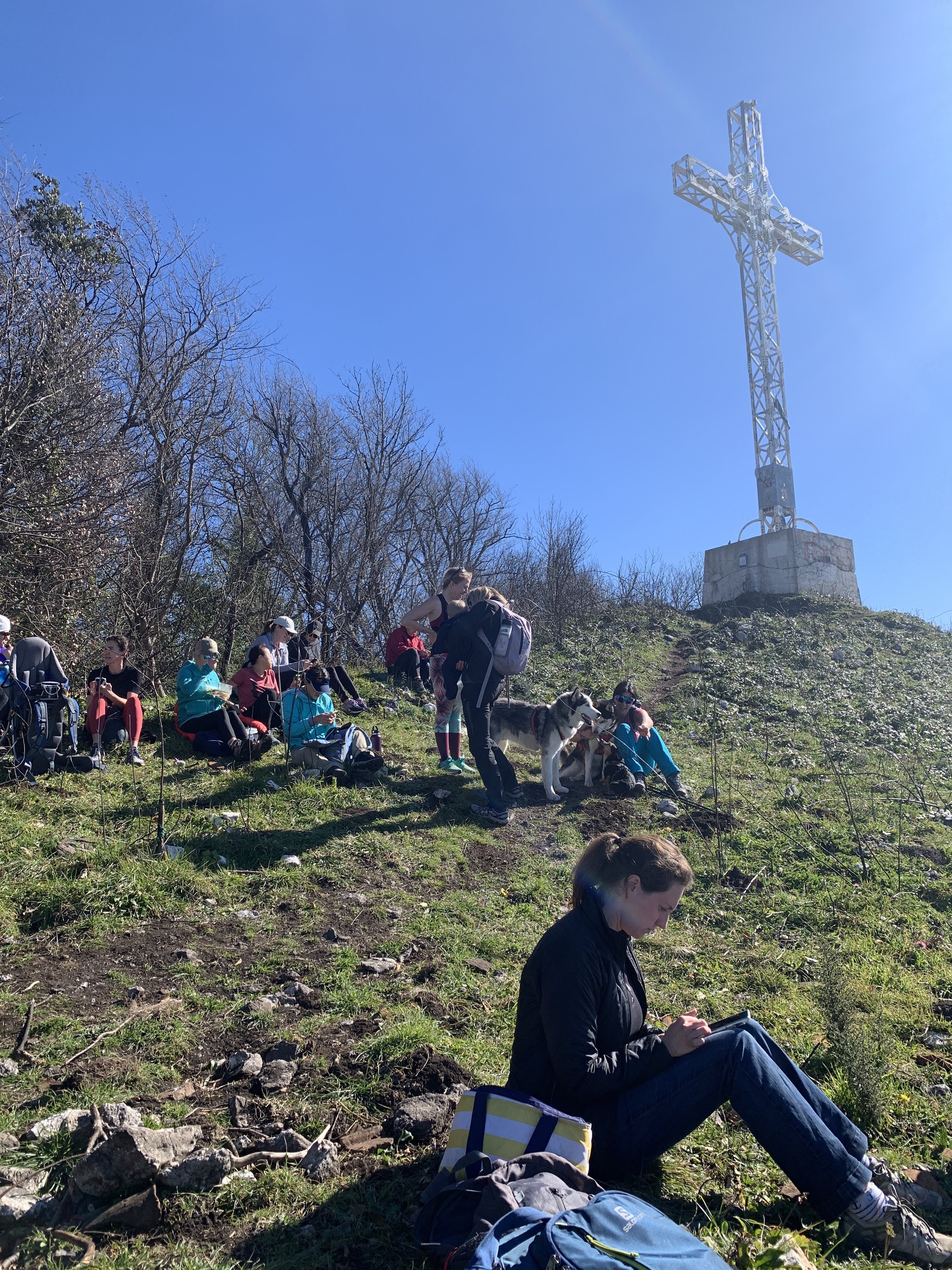 After this point the path becomes very steep and may require some scrambling. On the right hand side there is an abandoned advertising board (your guess is as good as mine!) and then dips into a small wood just behind the summit. Follow the track through the wood and up to the left, where you’ll emerge just below the cross.