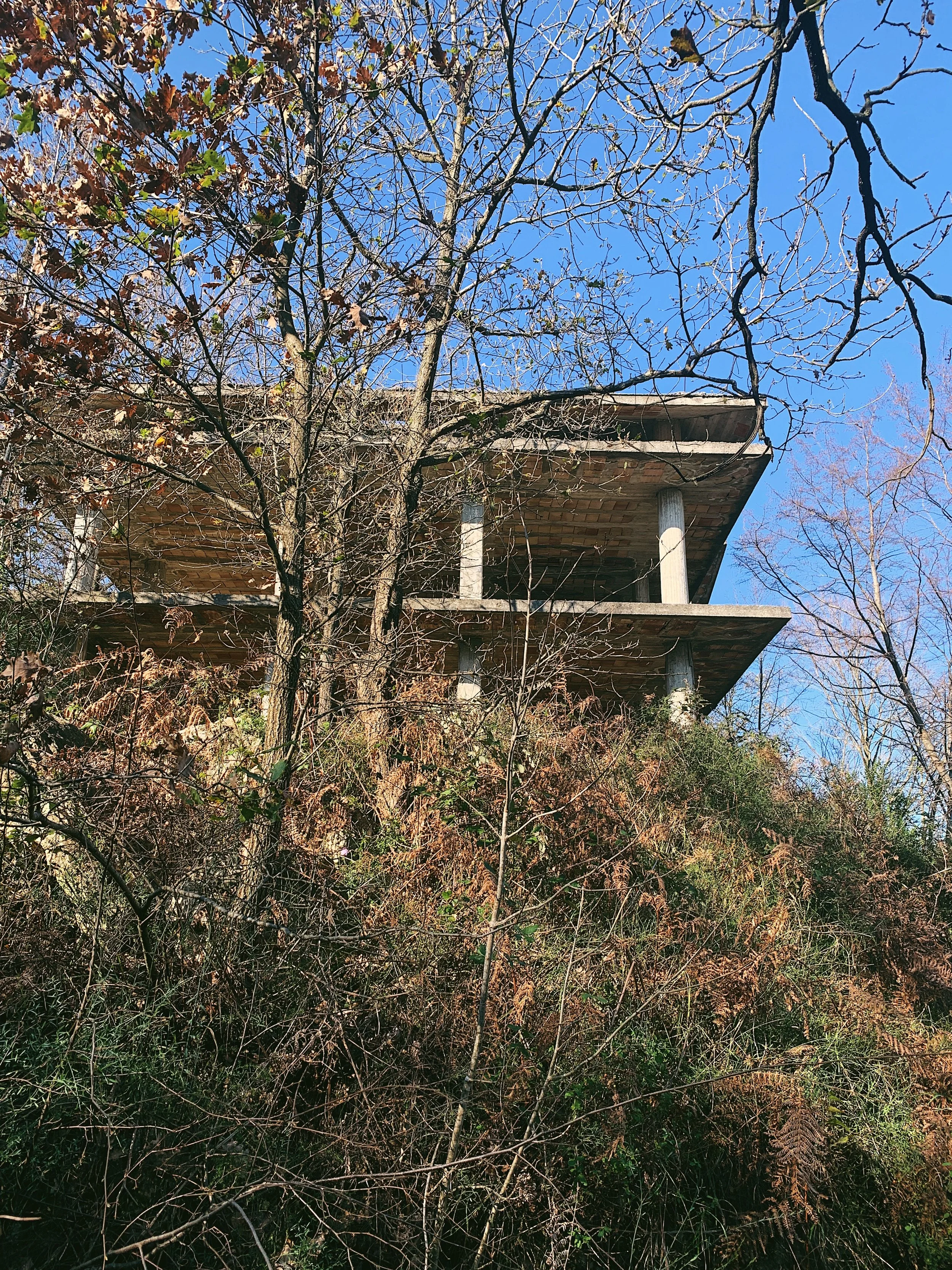 The trail begins at the car park. Follow the defined trail over the drain and past the house on the right hand side. After a short distance it splits: you can continue on the main trail where you will eventually reach a rusted iron gate. This may be locked, in which case you can retrace your steps and take the narrow trail up through the trees - this is quite uneven where the track has deteriorated, but does eventually rejoin the main path. Continue up the wide trail around a series of switchbacks: ignore the barrier that says ‘Proprieta R Donato’ and continue uphill past two huge concrete shells - these were likely planned to be villas but, like many buildings in Campania, lay abandoned.