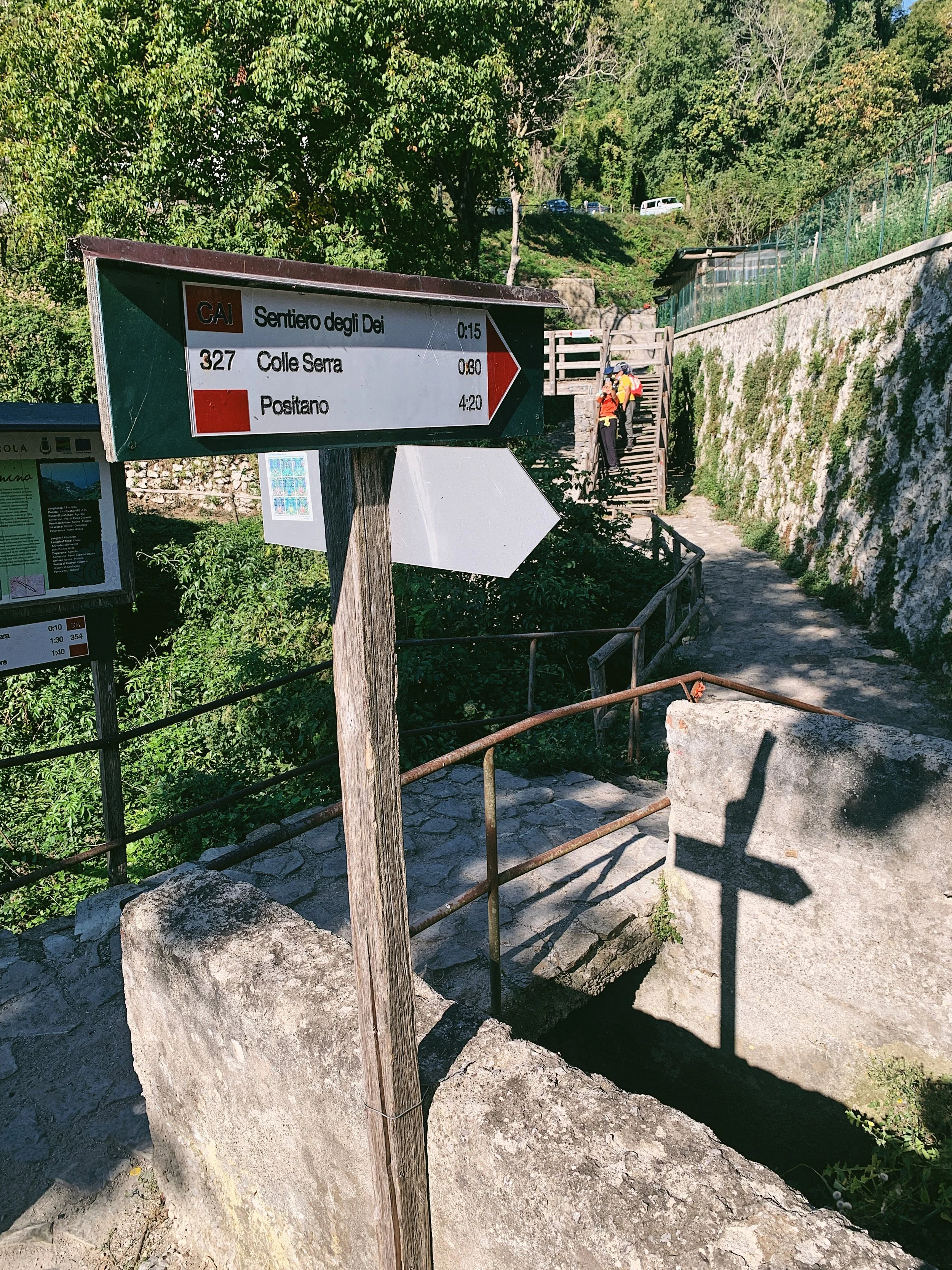 From the parking area in Agerola, leave the car park and turn left to walk up to the village square. There are signs for Sentiero degli Dei. At the top of the piazza, turn left and follow the road past the vending machines on the right to pass through a little residential area, following a slope downwards. Cross a wooden bridge and ignore the path to the left that leads down to Praiano. Head up a short flight of stairs and you’ll join the road at Bomerano. Turn left and follow the road up to the dead end, where there is another small parking area against the cliff. Here you’ll see the start of the walk, where there are signboards and a large sign on the cliffs.