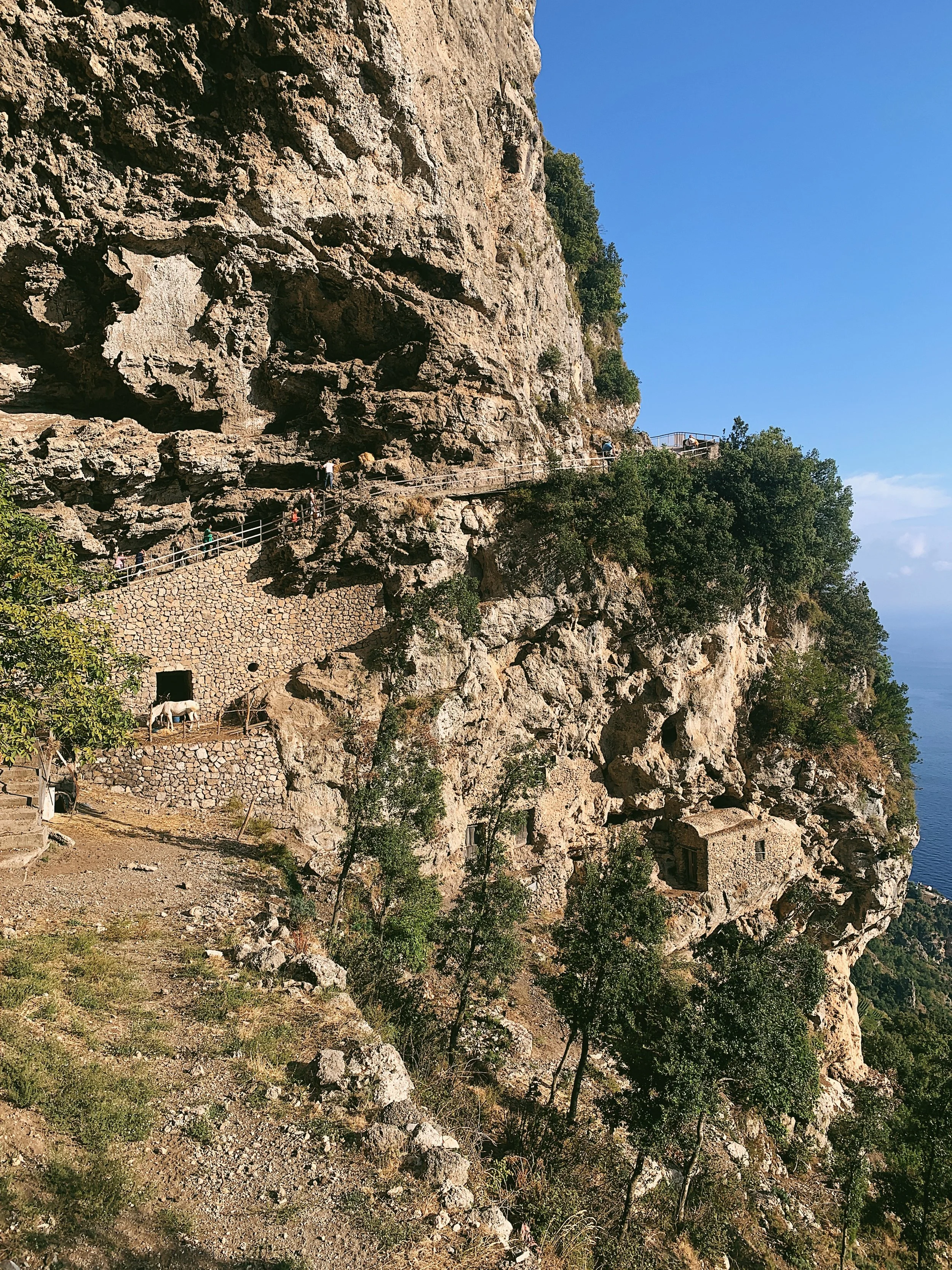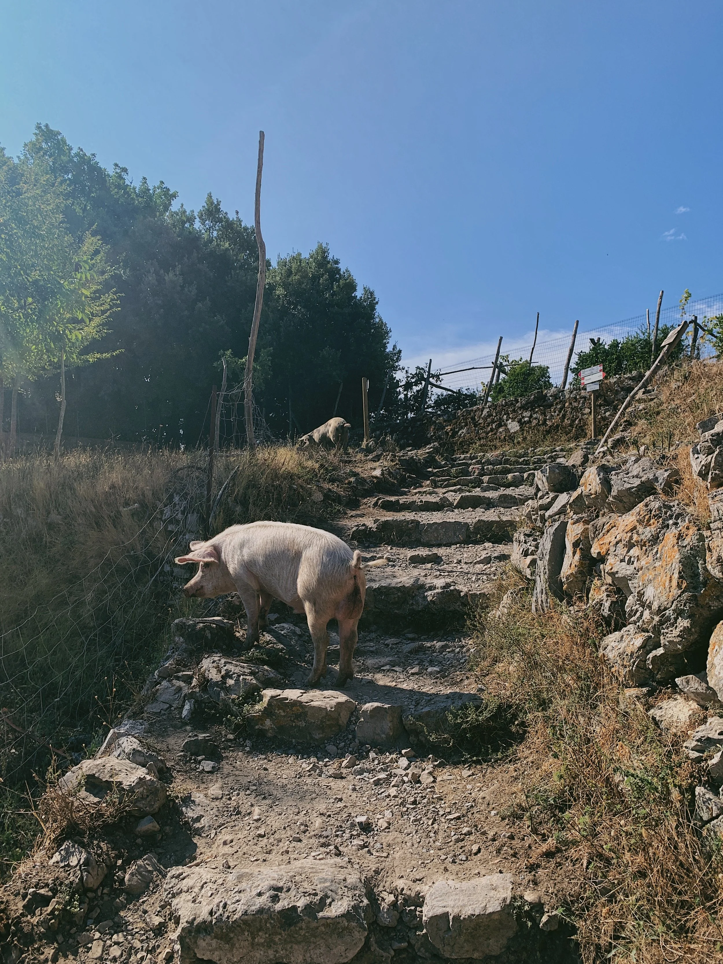 The route links the little hilltop town of Agerola - or more specifically, the little adjacent village of Bomerano - with Nocelle, the upper reaches of Positano set some 1,500 steps uphill from the main part of the village. There are no roads to cross or big settlements along the way, just little farmsteads clinging to the cliffs, lemon trees bowing under the weight of fruit and tiny pockets of vines. It’s truly idyllic: chickens pecking alongside the path, pigs and goats grazing quietly, horses flicking scraggly tails in little stables tucked under the cliffs. And all with that beautiful backdrop of endless blue.