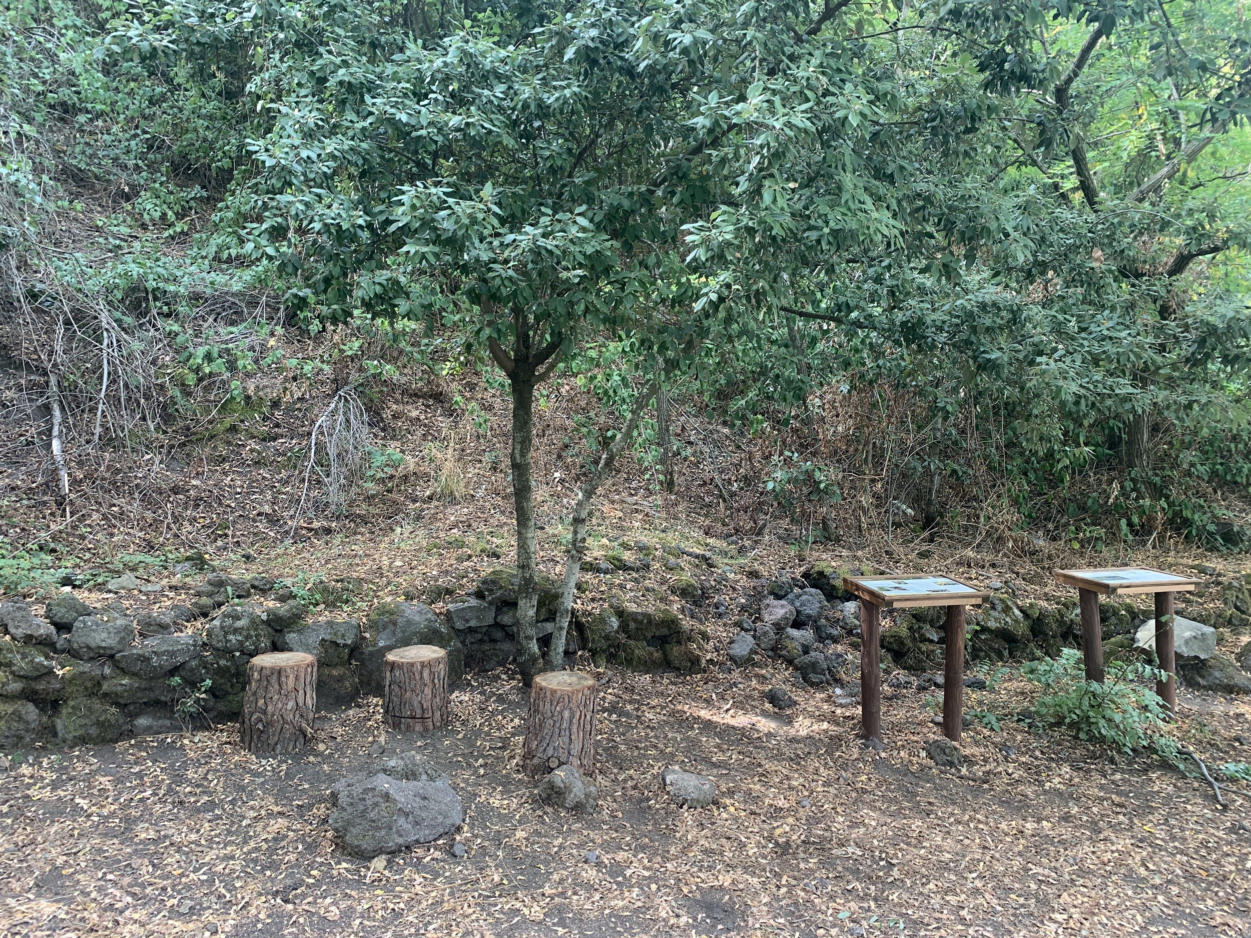 Continue downhill and fork left, following the pumice track to a wide, flat opening where several trails meet. This is marked on some maps as ‘Oasi’ and there is a small memorial at the middle between some trees where there are a couple of ramshackle benches. Take the first trail on the left (with the yellow signs) and follow the path back to the picnic area, then continue back to the car the same way that you came up. On the right, a short distance before you reach Largo Angelo Prisco again, there is path that joins the main trail with a ‘baracca forestale’ or forest shack. This is Sentiero 7 - called Il Vallone della Profica, an alternative route which, although an out-and-back route, follows a lovely trail through the dense forest, starting in San Giuseppe Vesuviana.