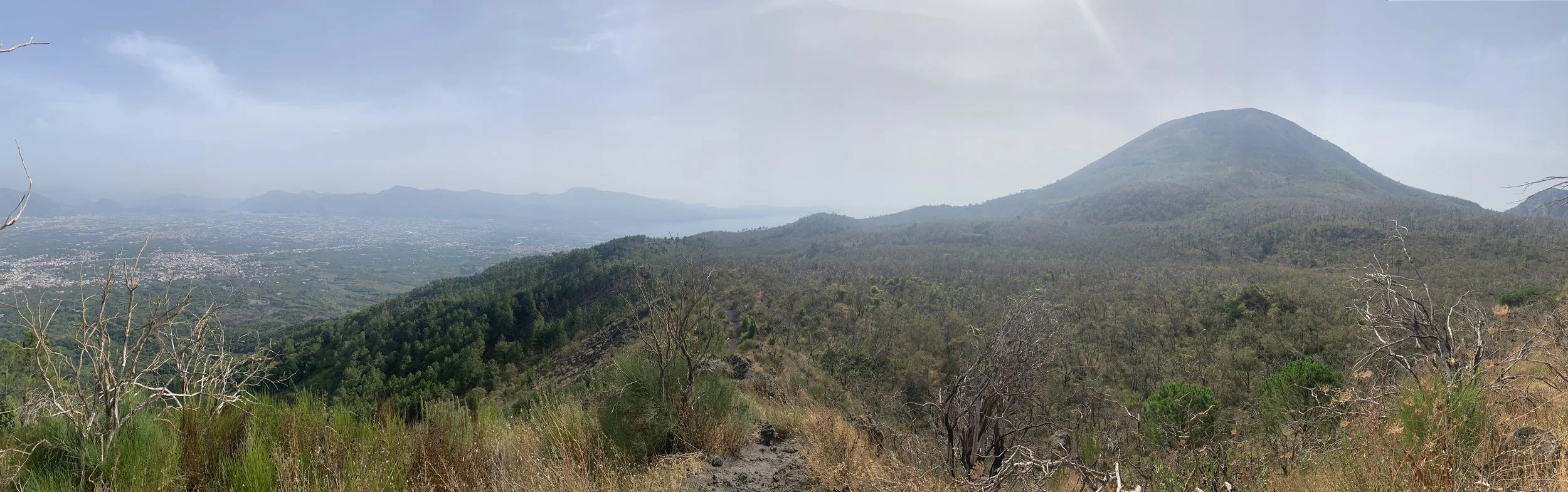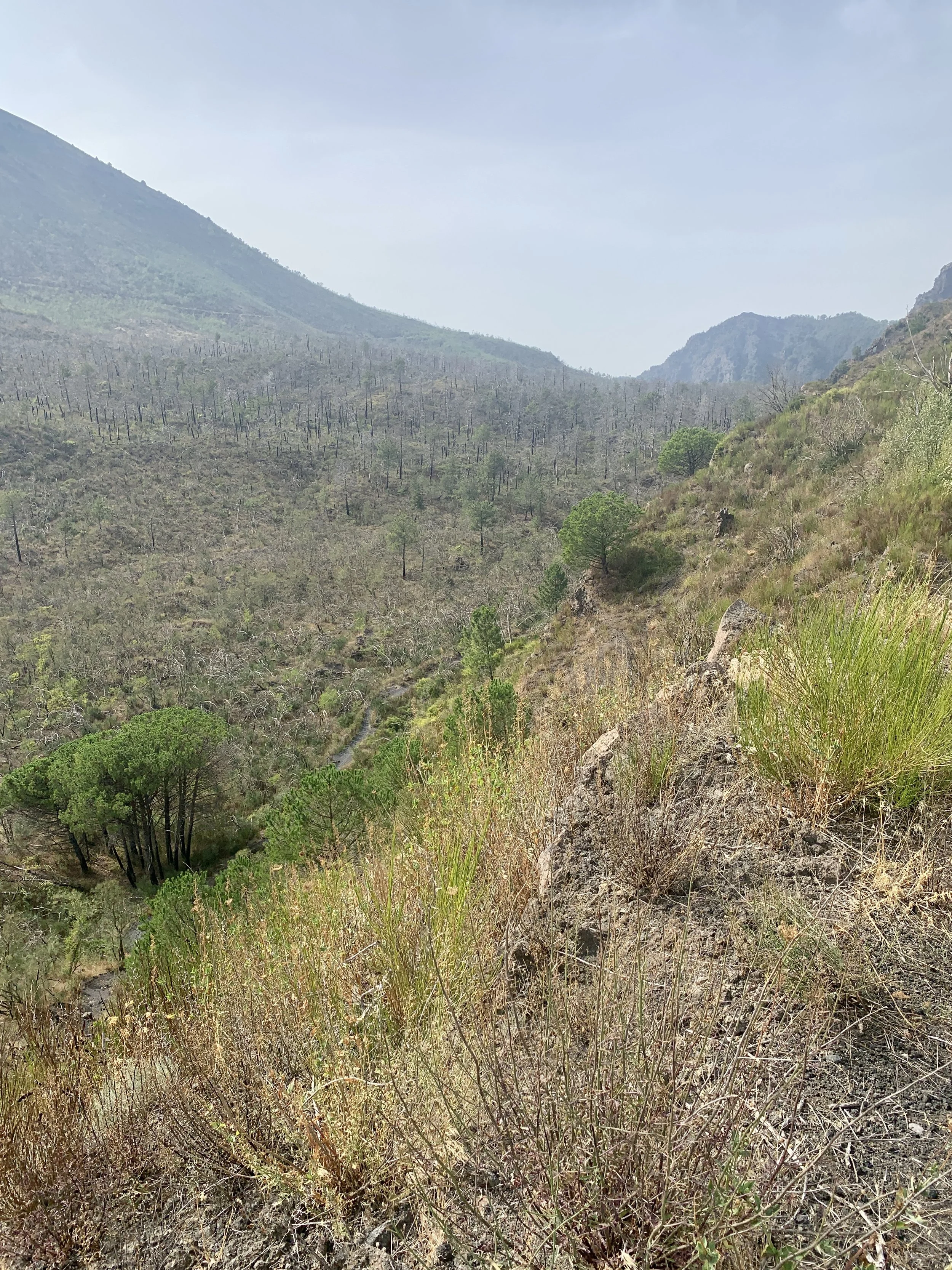 After a pause, facing the stumps, take the second major trail on the left leading uphill. This is where the trail deviates slightly from the published ‘Yellow Trail’. The wide trail continues up a series of switchbacks through the trees before ducking around the side of the hill and becoming a single track which appears to disappear behind a hill. The trail here is dense and the pumice becomes deeper. Eventually you will reach a fork in the trail. Take the left fork up towards a high ridge and enjoy the view of Naples below and a view over the Valle dell’Inferno, Punta Nasone to the right and the great cone of Vesuvio rising in front. It’s also possible to look across to the collapsed caldera of Monte Somma, which is characterised by its rugged humps called cognoli.