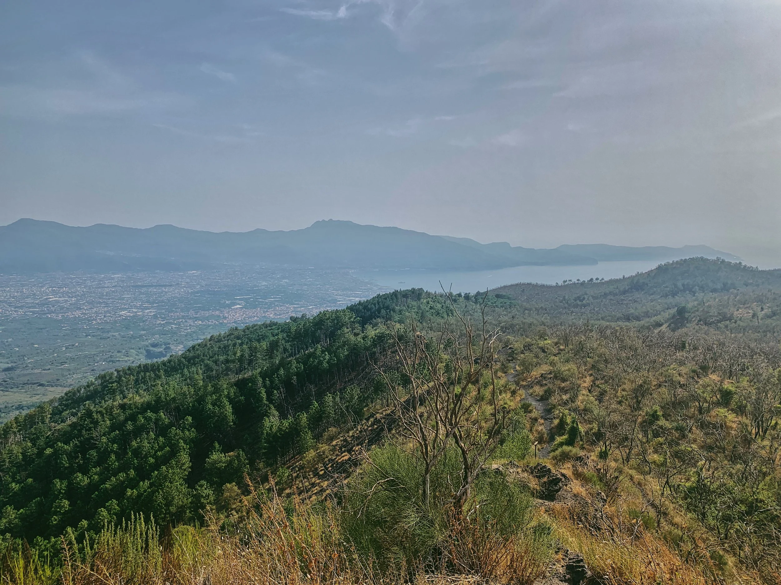 For those taking the normal route, head down from the ridge. There is some scrambling over rocks here to get down where you will need two hands to pull yourself up and over, but the trail is easy to follow; take your time. You will soon find yourself next to the fascinating cooled lava, leftover from a former eruption. This is marked on maps as lava in corda, and is from the more recent eruptions. The lava has cooled in the shape of thick ropes, and you will need to walk down over the hardened rock along the path. En route there are far reaching views over the north and east suburbs of Naples towards the Sorrentine Peninsula.